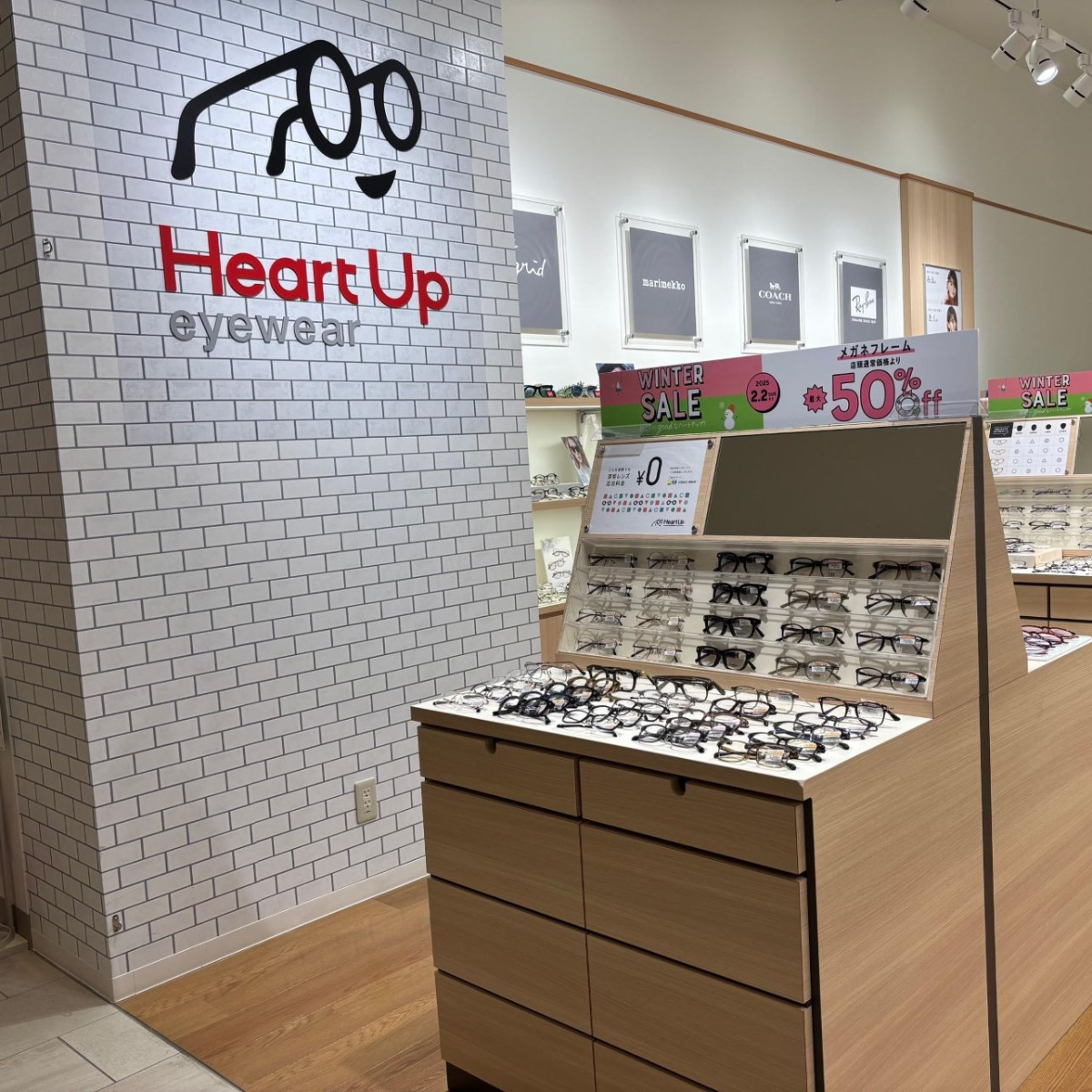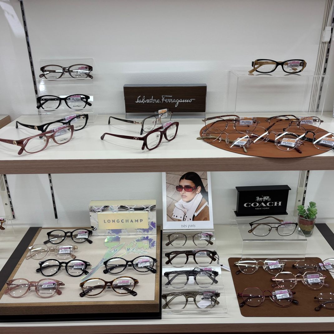 メガネはシンプルなプライスラインでトレンドから定番フレームまで幅広く取り揃え、超薄型レンズでも追加料金なしで安心♪