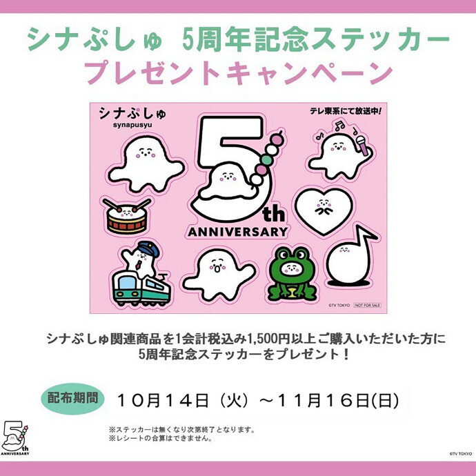 シナぷしゅ関連商品を1会計税込1,500円以上ご購入いただいたお客様に5周年記念ステッカーをプレゼント!