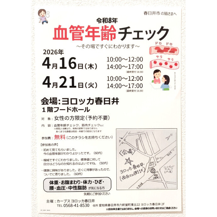 ヨロッカ春日井1階フードホール前にて無料血管年齢測定会を